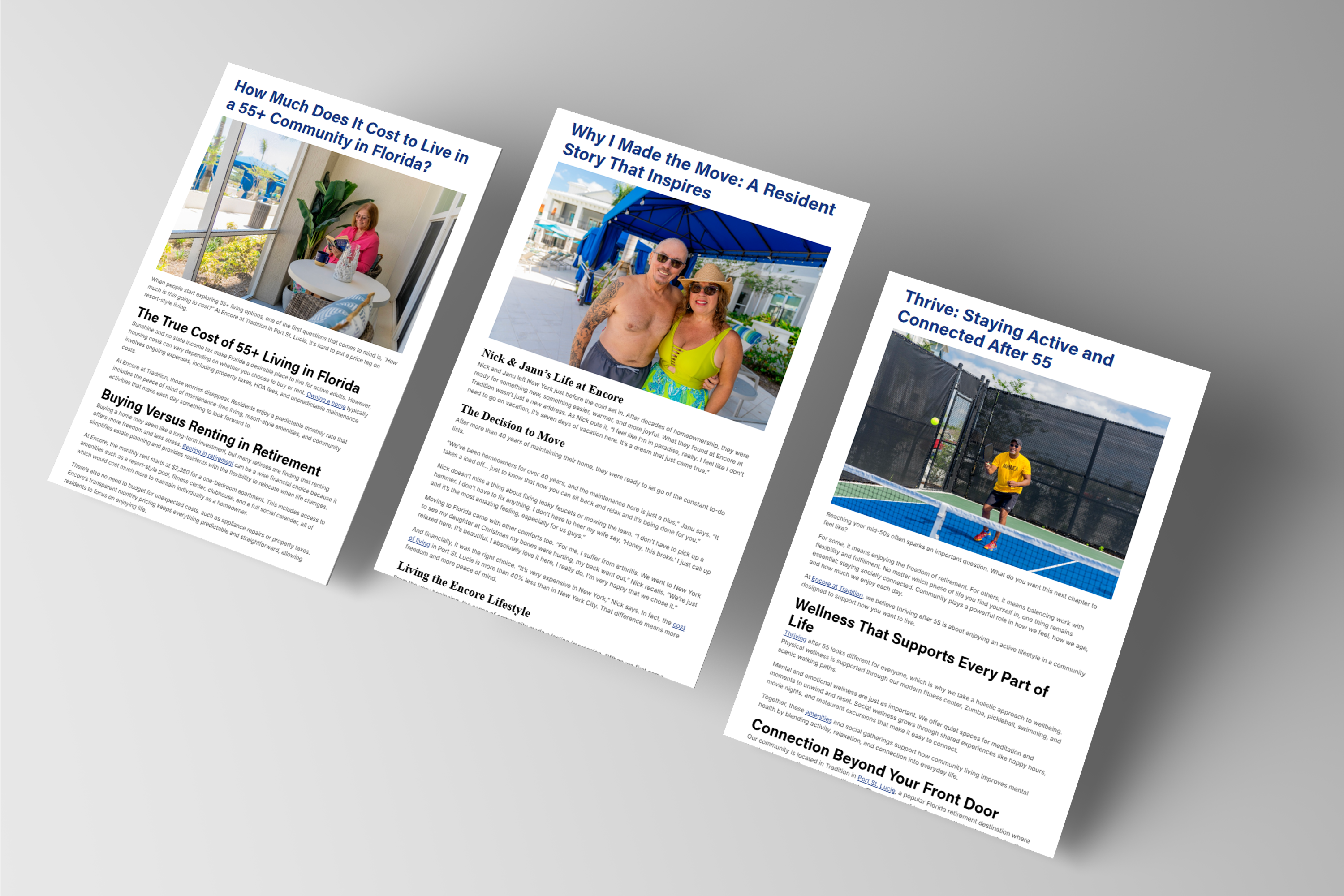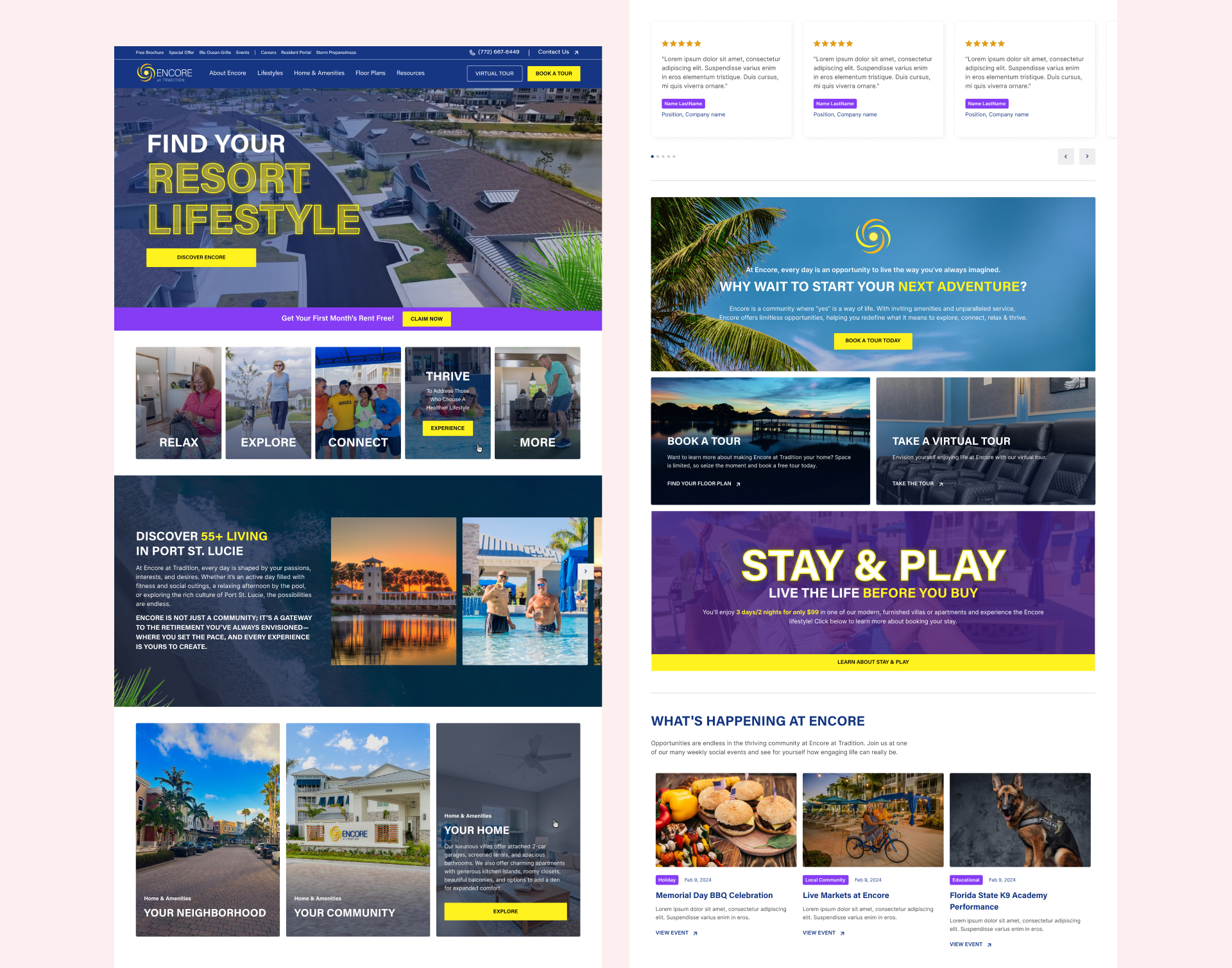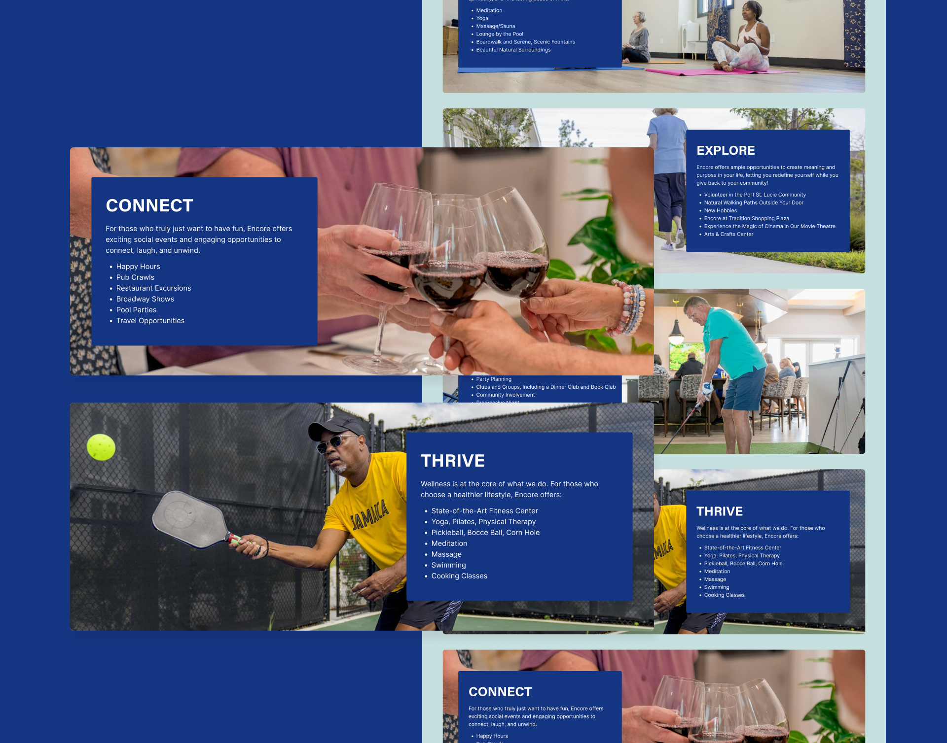 One of the most meaningful strategic contributions was developing the five lifestyle pillars that now anchor everything Encore communicates: Relax, Explore, Connect, Thrive, and More. These aren't just navigation labels. They're a content strategy and a brand promise, giving the community a framework to organize events, social posts, blog content, and marketing campaigns around the actual experiences residents come to Encore for. Every piece of content has a home, and every prospective resident can immediately see themselves somewhere in that story.